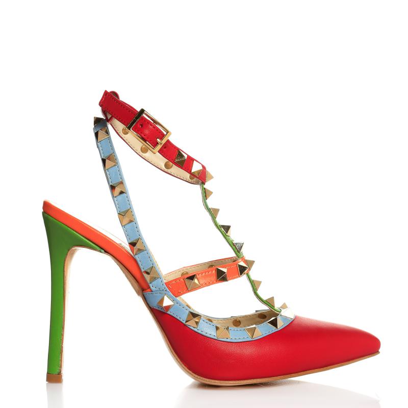 Kırmızı & Mavi & Turuncu & Yeşil Deri T Bantlı Pimli Ayakkabı