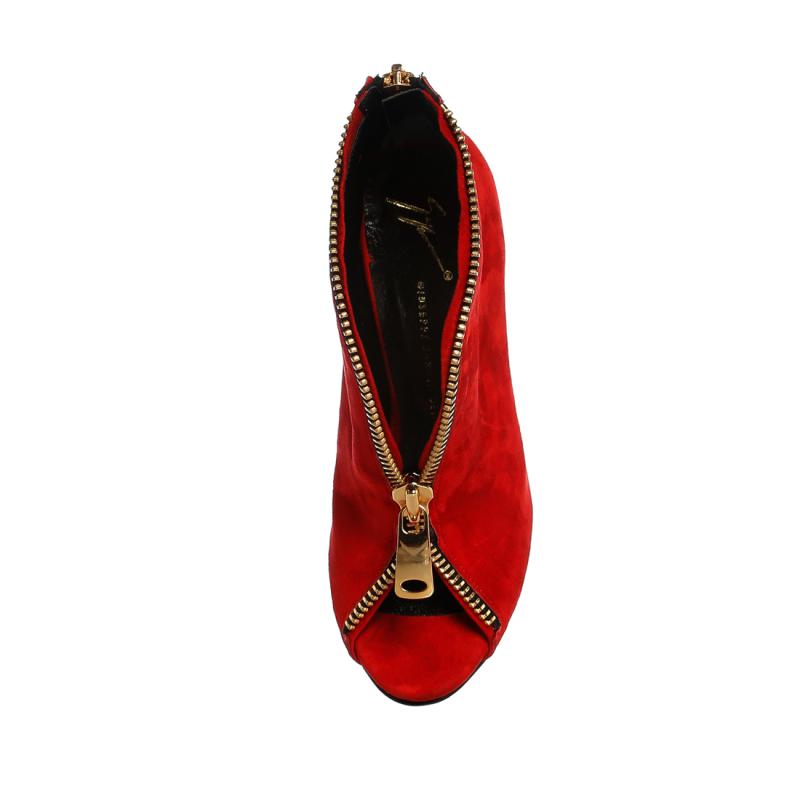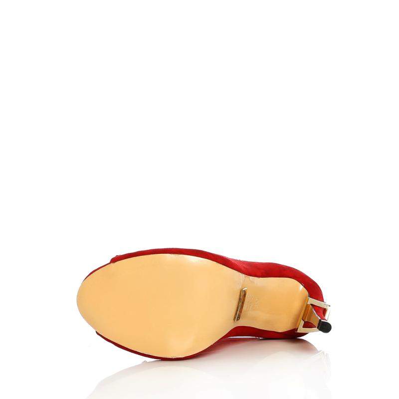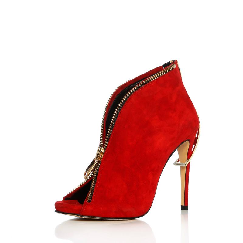 Kırmızı Süet Önden Fermuar Aksesuarlı & Topuktan Geçmeli Fermuarlı Topuk Tokalı Bootie