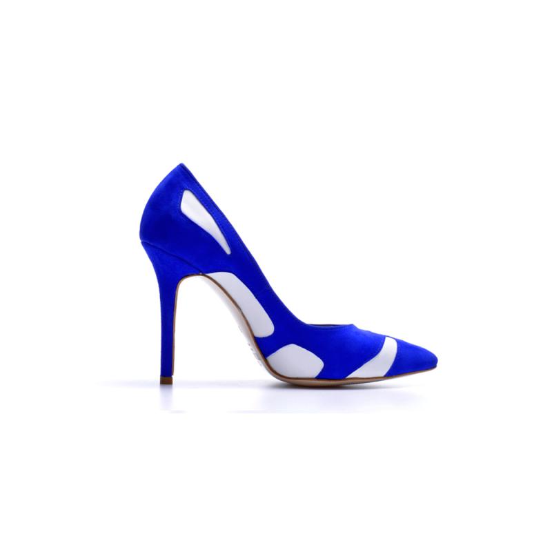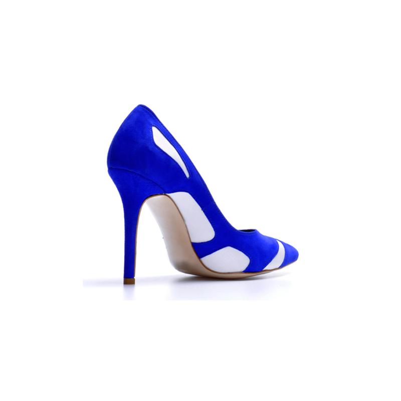 Saks Mavisi Süet & Beyaz Deri Patchwork Stiletto Ayakkabı