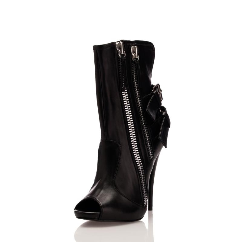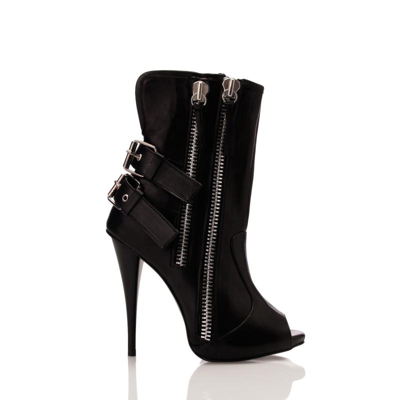 Siyah Deri Çift Tokalı Çift Fermuarlı Bot