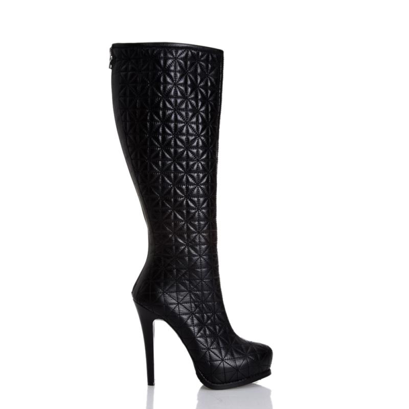 Siyah Deri Kapitoneli Arkadan Fermuarlı Vardolalı Çizme